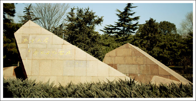 This monument consists of five tablets, the main tablet has a height of four meters, which represents the spirit of the May 4th movement. The slant wavy shape of tablet symbolized the courage and spirit of advancing martyrs, teachers and students of Peking University. Around the monuments are cobbles covering the ground, stand for that the martyrs beating the obstacles on the road of revolution and making ways for the descendants. With its unique shape, it took the most room among the monuments, and it was designed by Mr. QinPu of China sculpture arts research institution, carved Monument of the Martyrs of Peking University, Written by ChenYun in golden characters, the reverse side carved with the inscription and names, native places, times of those 83 martyrs.