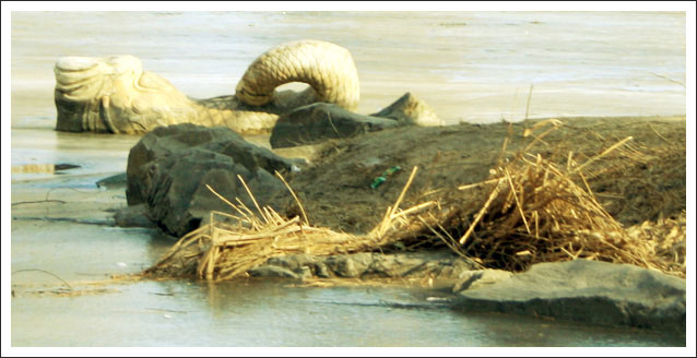 During the Cultural Revolution, the fish encountered misfortune that it was pushed to lake. After “the gang of four” was broken down, in the summer of 1981, when the lake was dried, the fish appeared again. But unfortunately, the tail and mouth were destroyed. The school tried every means to mend it as its original appearance. Now it’s placed near the west of the WeiMing Lake. It looks like that the fish keeps the shadow of the tower in mouth.